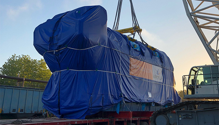 The remaining three engines were stored in L’Anse until September when they were delivered directly into the engine hall building at the A.J. Mihm Generating Station. Those deliveries used a single truck and a single 100-foot-long trailer with 160 wheels.